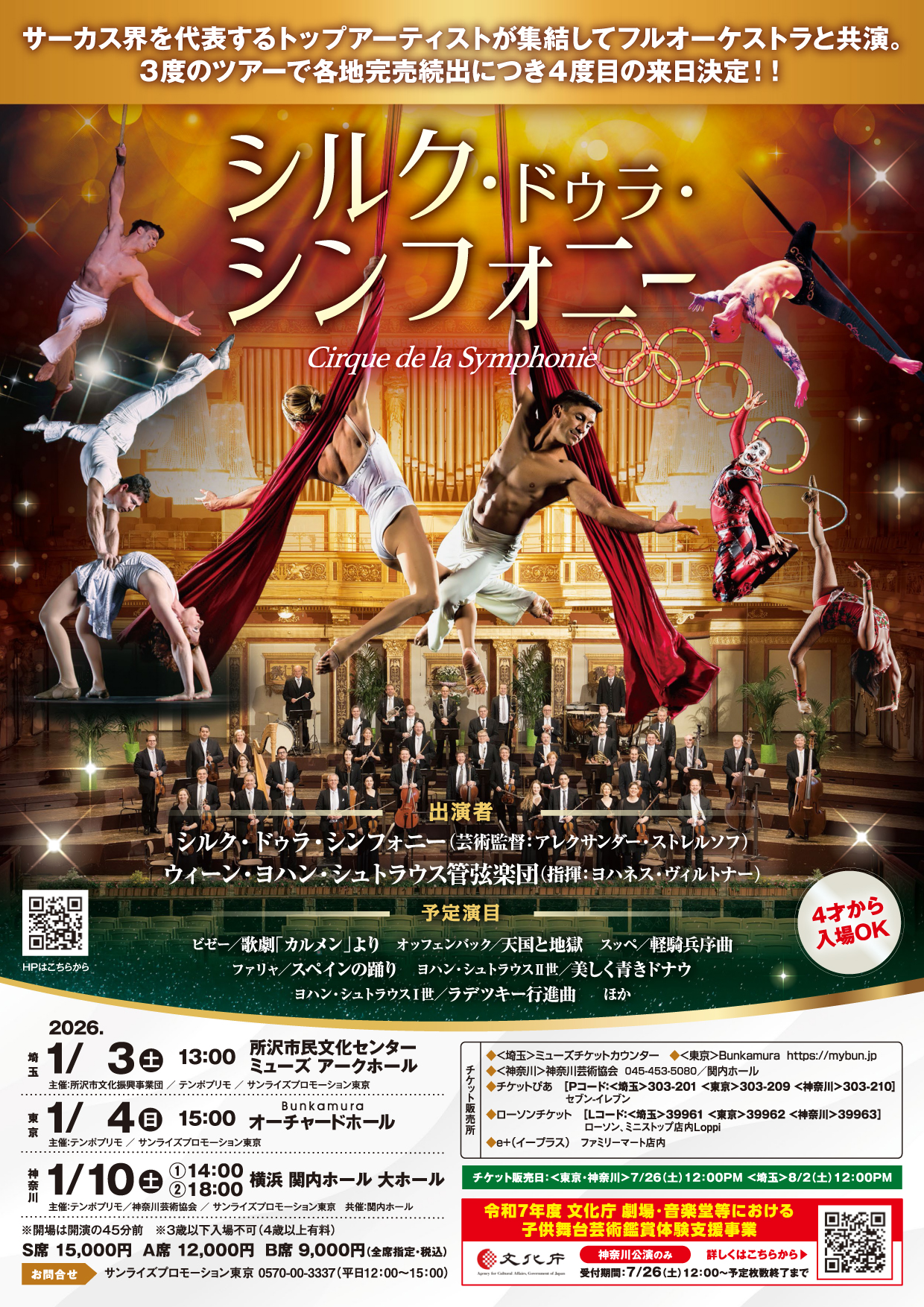 ※4歳以上から入場可 ※車椅子席をご希望のお客様はサンライズプロモーション東京(0570-00-3337)へお問い合わせください。 令和7年度 文化庁 劇場・音楽堂等における子供舞台芸術鑑賞体験支援事業 このたび、「シルク・ドゥラ・シンフォニー2026」(横浜関内ホール)について、文化庁による劇場・音楽堂等における子供舞台芸術鑑賞体験支援事業に申請しております。平成19年(2007年)4月2日以降に生まれた18歳以下のお子様を無料でご招待いたします。(各回 全110席 保護者等同伴席各回 全75席) 詳細・申込は下記URL(別サイト)をご確認ください。※申込開始は7月26日12:00からとなります。 |
